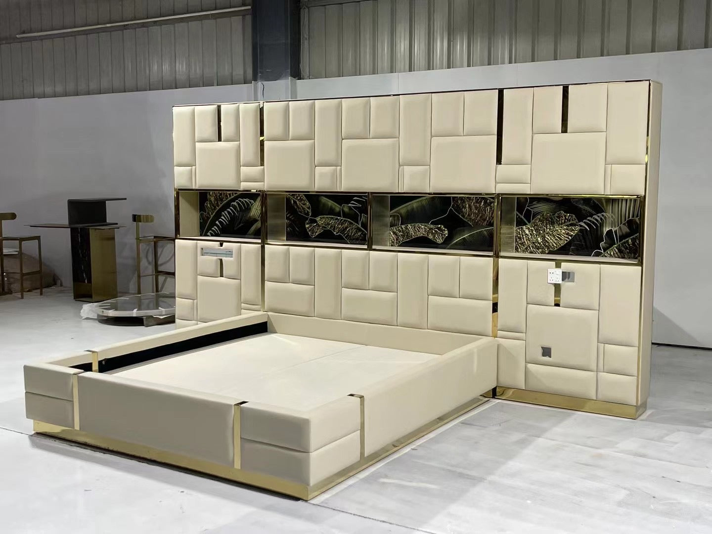 Leather and velvet are good choice for this bed in general. The 304 stainless steel strips decoration makes it luxury. Head board hollow-in shelf is functional design. You’ll love this bed if you are the one who loves combine functions with fashion. Enjoy your shopping!